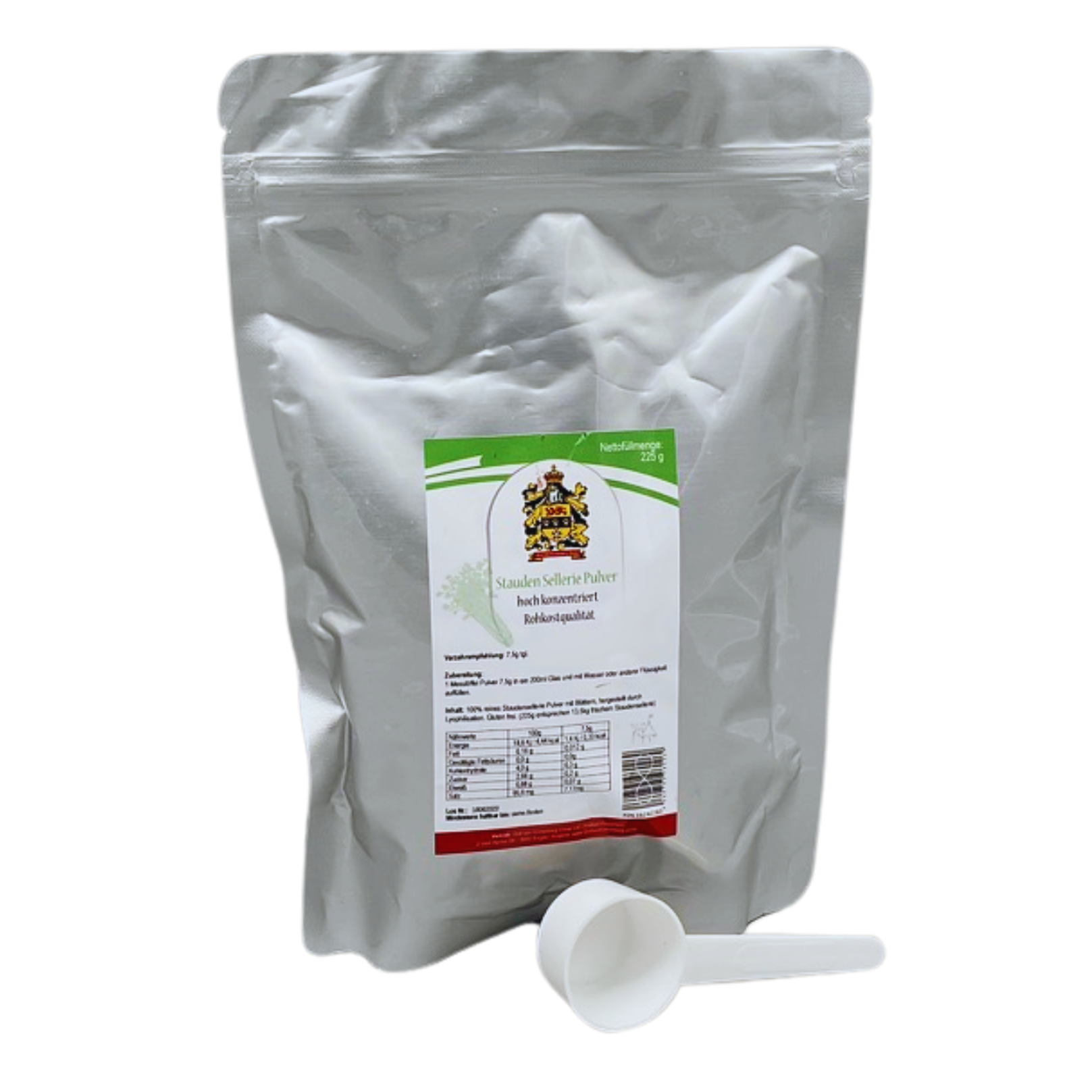 Inhalt der Monatskur: 225 g hoch konzentriertes Selleriepulver (entspricht ca. 13,5 kg frischem Bio-Stangensellerie), Messlöffel und Verpackung mit Zip-Verschluss.
