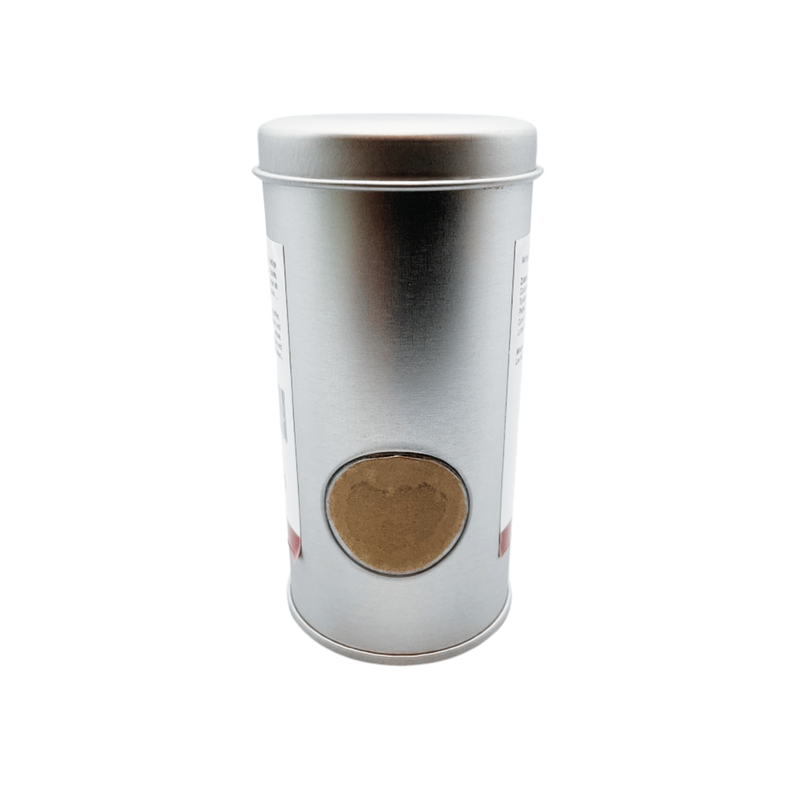 Hochwertige runde Stülpdeckeldose aus elektrolytischem Weißblech, mit Sichtfenster im Rumpf, Streueinsatz aus Kunststoff.