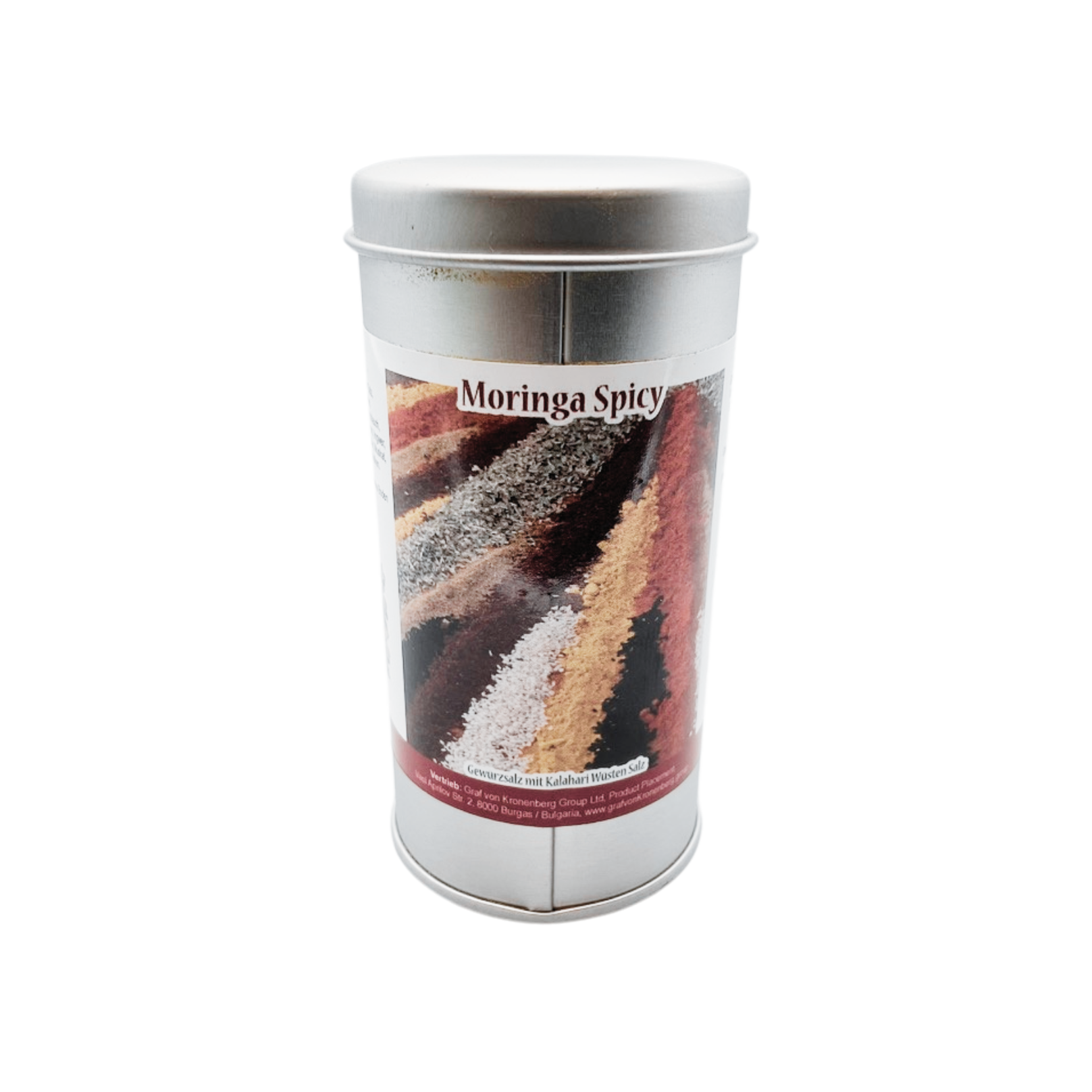 Zutaten: Moringa, Kalahari Salz, Curcuma, Paprika, Koriander, Tomatenpulver, Zwiebel, Knoblauch, Pfeffer, Zimt, Chili, Cardamom, Ingwer, Cumin, Anis, Kubeben-Pfeffer, Muskat, Lorbeerblätter, Stern-Anis, Nelken.