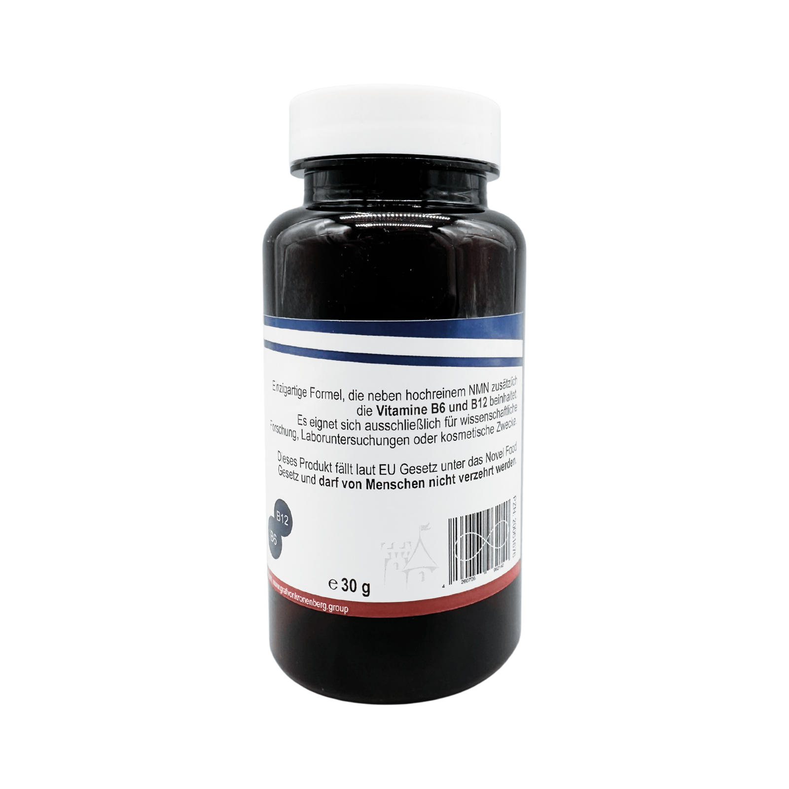 Bei NMN handelt es sich um eine in der EU aktuell nicht als Lebensmittel oder Nahrungsergänzungsmittel zugelassene Substanz gemäß der EU Novel-Food-Verordnung. Verkauf ausschließlich zu Forschungszwecken / nicht für den menschlichen Verzehr bestimmt.